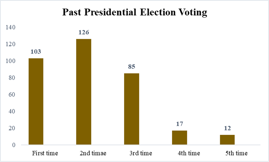 This category received the least support, with 12 votes, representing 3% of the total. This suggests that very few respondents have voted five times or more, indicating that long-term voters are a small segment of the overall group.
