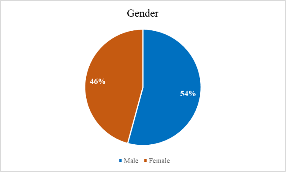 The survey captured a total of 343 respondents, with a relatively balanced gender distribution. Female participants accounted for 157 respondents (46% of the sample), while male participants numbered 186 (54%). This composition demonstrates near-equal representation, with only a slight skew toward male respondents.