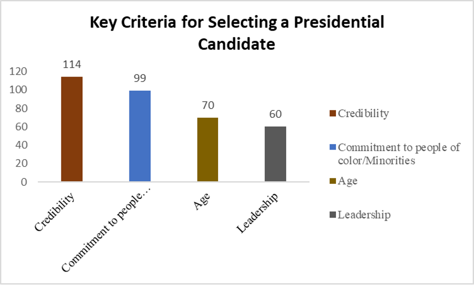 This attribute received 70 votes, making up 20% of the total. While it is a relevant consideration, it ranks lower than credibility and commitment to minorities, indicating that age is a factor but not as critical as the top two attributes.