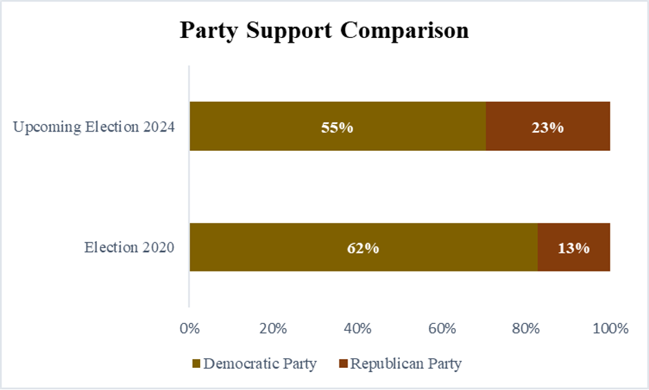 The data illustrates a shift in party support from the 2020 election to the upcoming 2024 election. The Democratic Party, which held 62% support in 2020, has experienced a decrease to 55% for the upcoming election. In contrast, the Republican Party has seen an increase in support, rising from 13% in 2020 to 23% for the 2024 election.