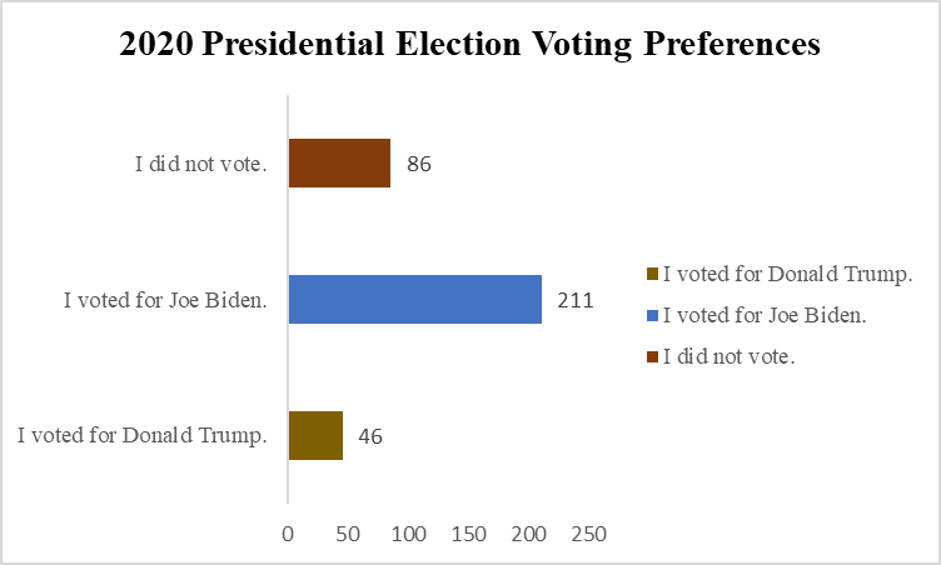 This option garnered 46 votes, representing 13% of the total. This indicates that Donald Trump received significantly less support compared to Joe Biden, reflecting a minority preference among the respondents.