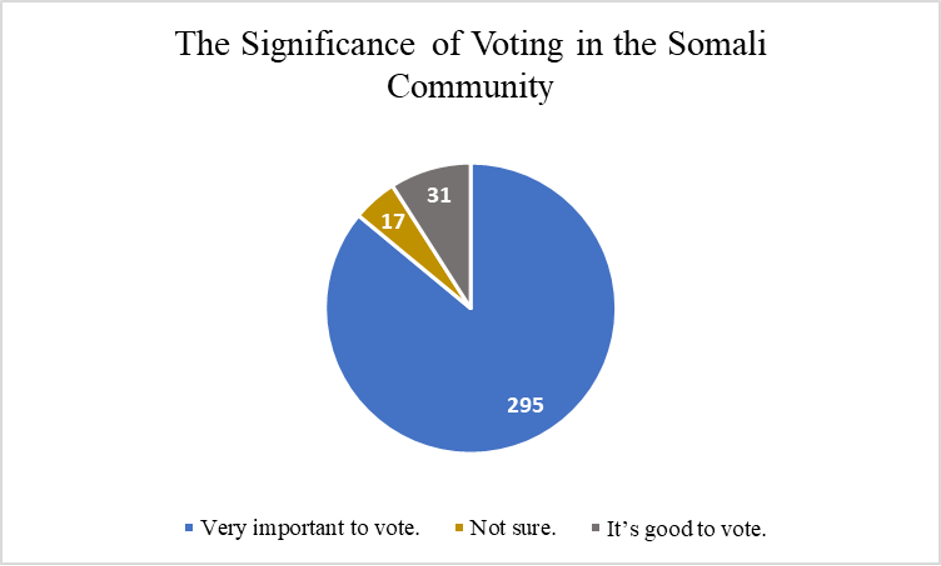 First, the importance of voting and electoral participation: The research highlights the need for active participation by the Somali community in Minnesota in elections and electoral processes. This requires raising awareness about the significance of voting and understanding how to select candidates based on programs that align with the community’s interests. The survey findings indicate that electoral participation is essential for achieving fair representation and ensuring the community’s effective contribution to democratic governance.