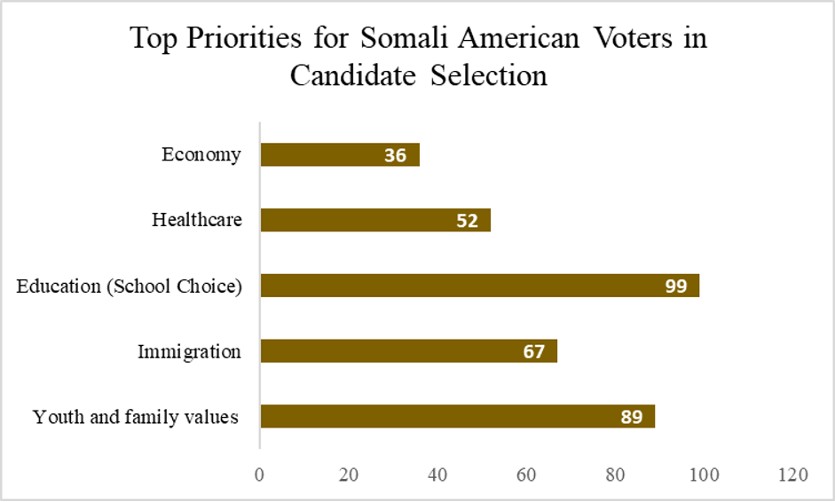 Finally, the research findings highlight several key priorities within the Somali community, such as school choice, family and youth values, and public safety, which align closely with positions typically associated with the Republican Party. However, the community’s ongoing support for the Democratic Party reflects that candidate credibility and trustworthiness are the most valued qualities for them. This indicates that trust and reliability play a decisive role in the community’s voting behavior. Furthermore, it demonstrates that the Democratic Party’s openness and commitment to diversity and inclusion, especially with minorities and people of color, are significant factors in maintaining the Somali American community’s loyalty, despite some alignment with Republican values on certain issues.
