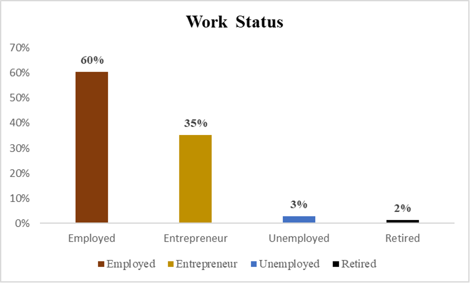 This group represents the majority of the survey respondents, accounting for 60% of the sample. The high proportion of employed individuals suggests that the survey captured significant perspectives from the active workforce. This strong representation provides valuable insights into current workplace trends, employee experiences, and professional viewpoints. The responses from this group are likely to reflect contemporary work environments, challenges, and opportunities across various industries and sectors.